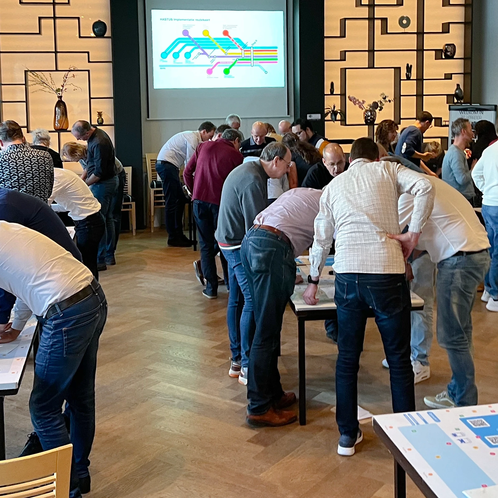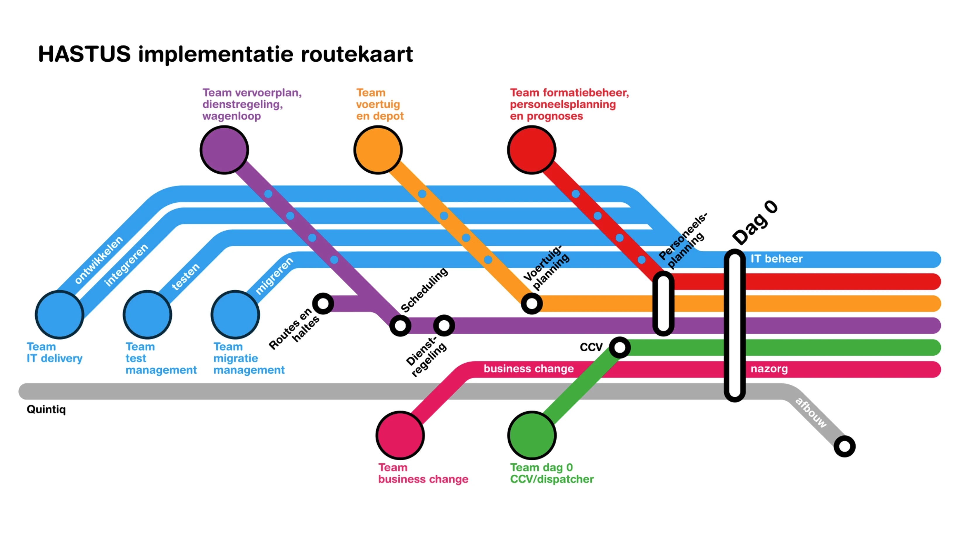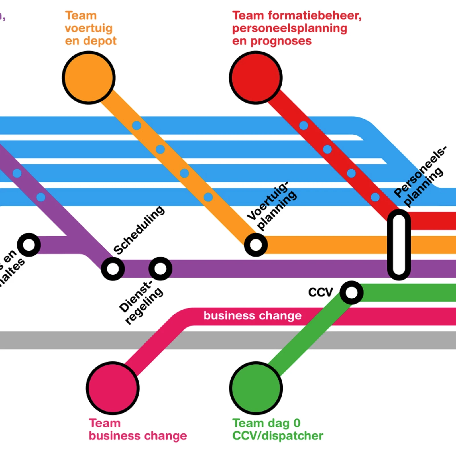 We creëerden een procestekening, in de vorm van een metrolijnenkaart. Het had direct effect op de afstemming tussen de teams, omdat duidelijk te zien was wie van wie afhankelijk was.