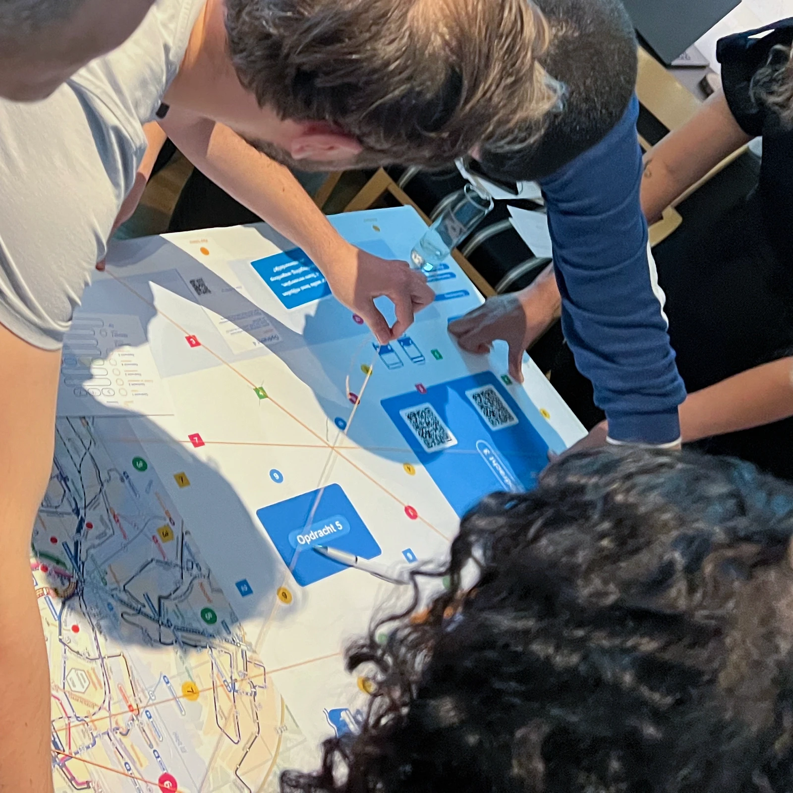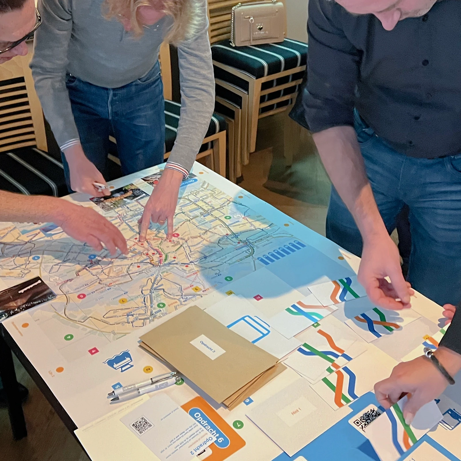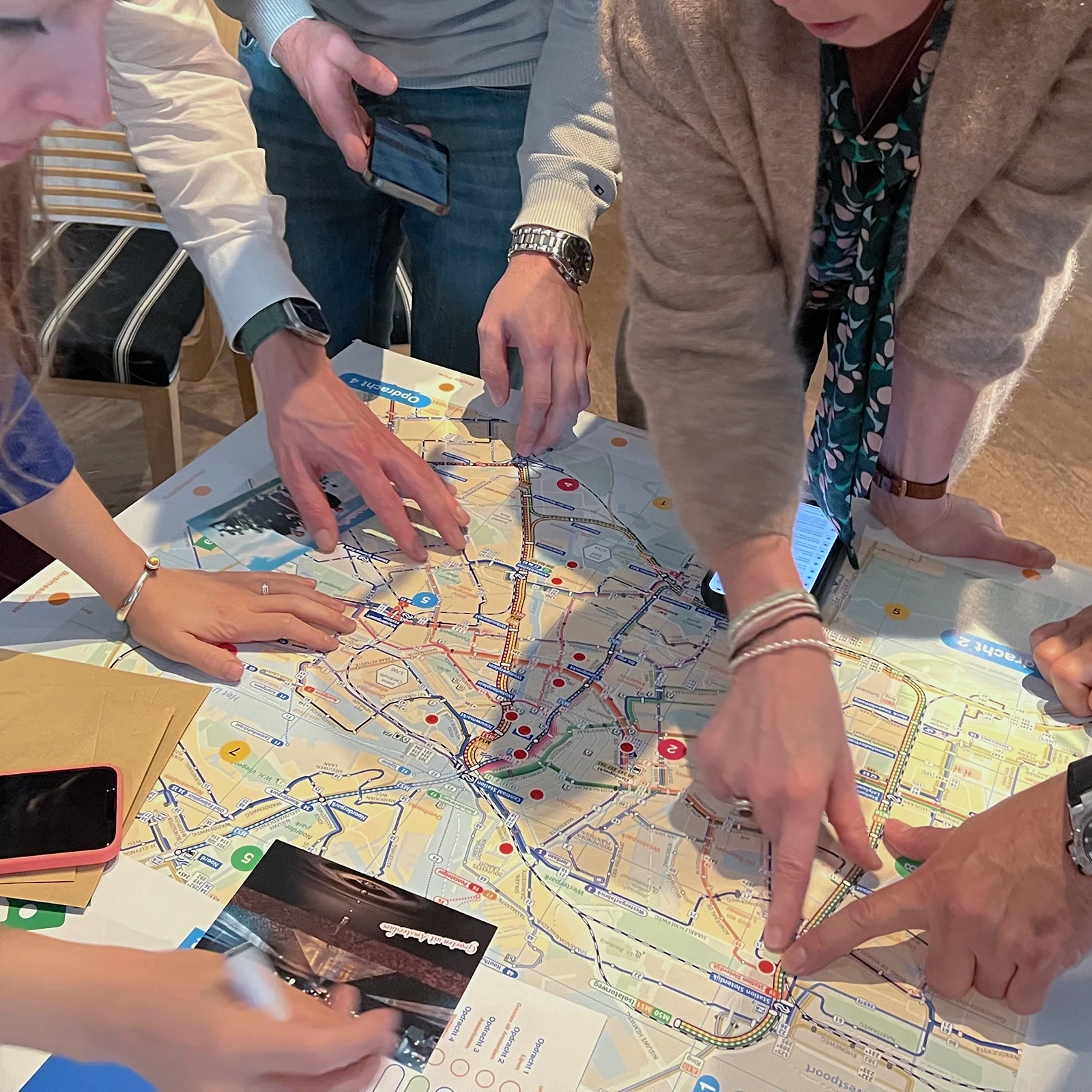 Inzichten rond samenwerking en onderlinge afstemming kwamen indringend en vrolijk aan bod in een spel dat we speciaal voor de groep maakten. Het spel werd in groepjes gespeeld rond een speelveld met de GVB lijnenkaart, GVB symboliek en cryptische ’Groeten uit Amsterdam’ ansichtkaarten. De deelnemers waren enthousiast en heel positief; in een nagesprek werden de inzichten samen becommentarieerd.
