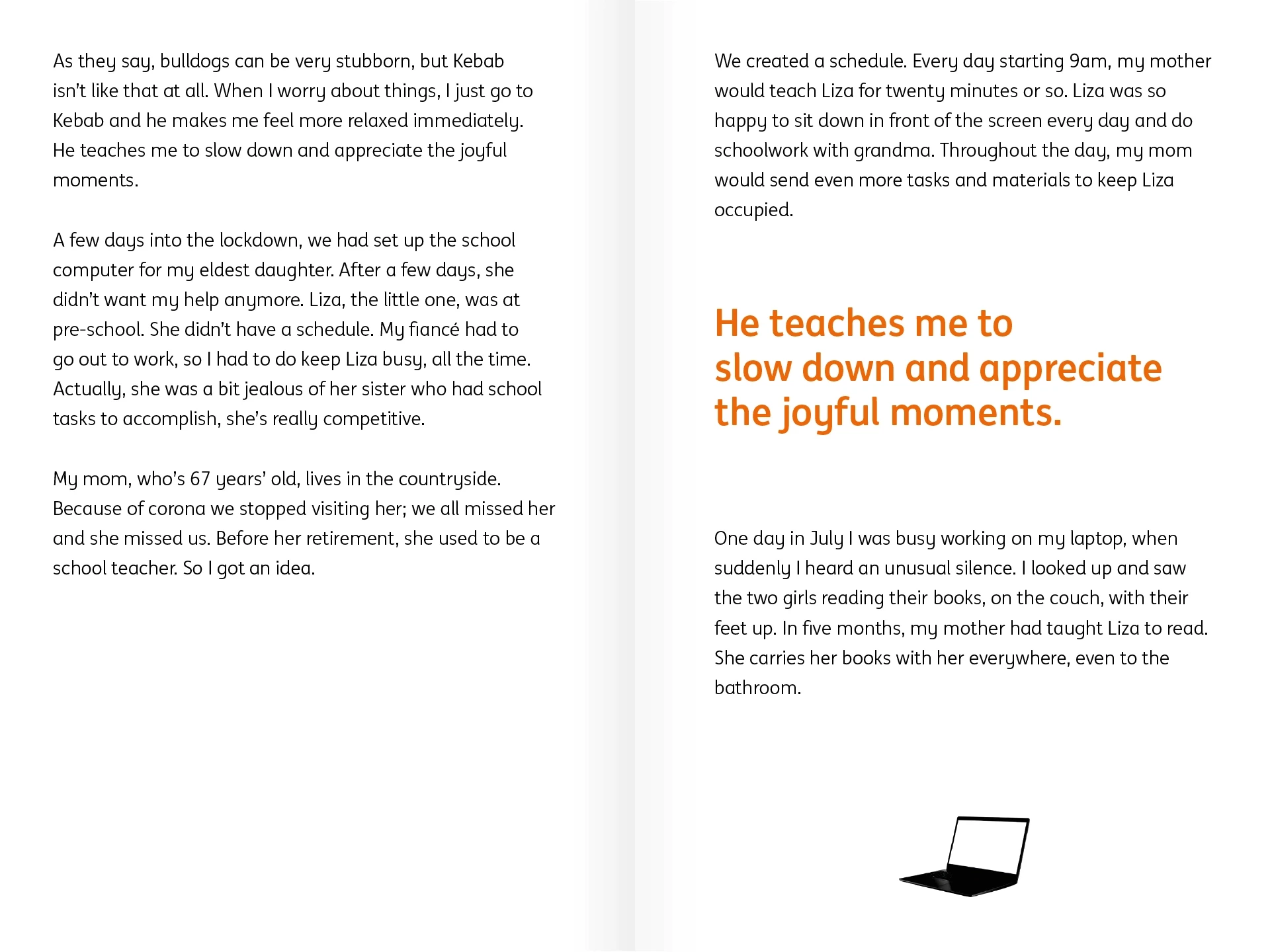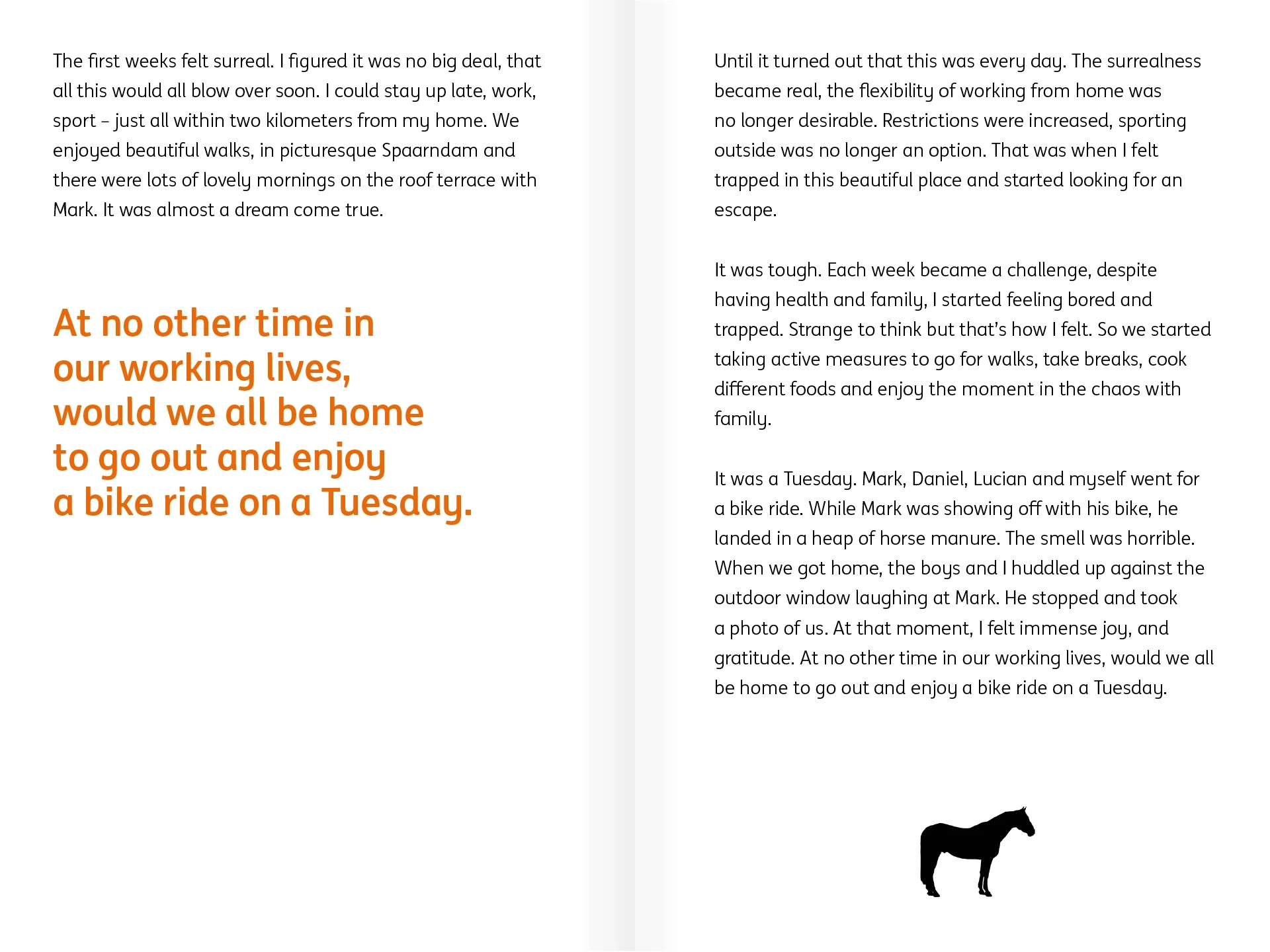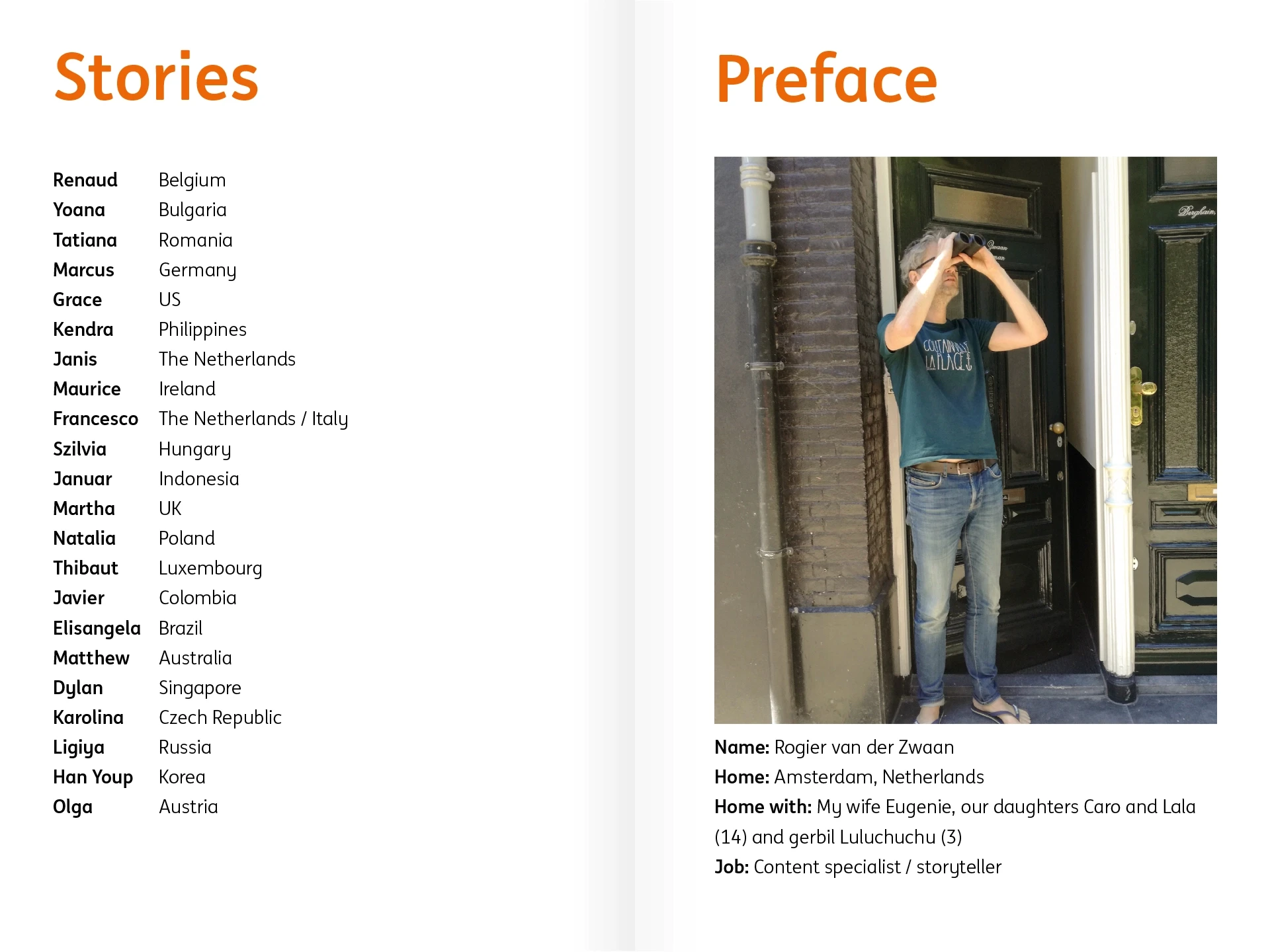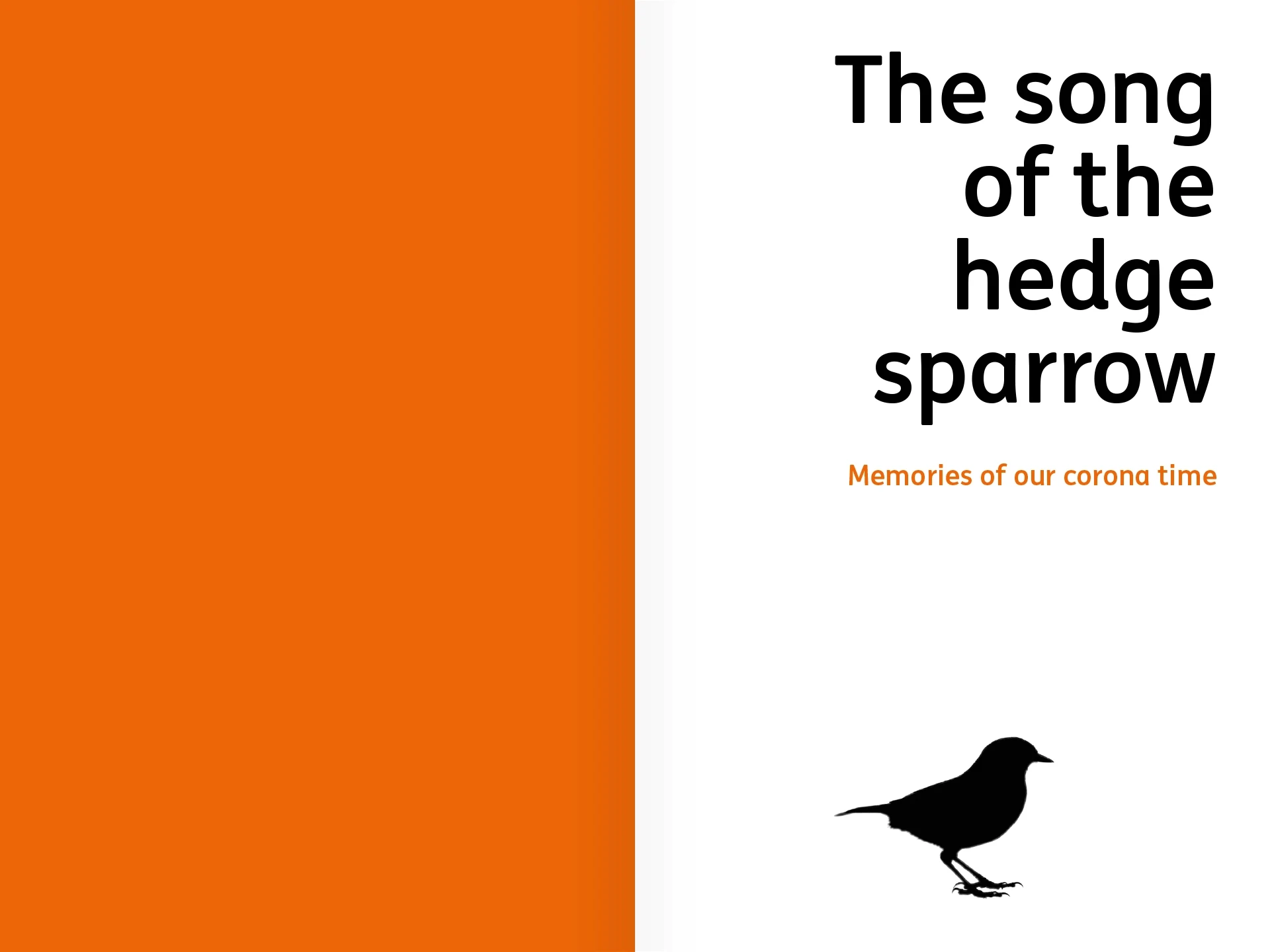 The song of the hedge sparrow is one of the favourite memories of Rogier van der Zwaan, during the peaceful first weeks in lockdown, in 2020. Curious for similar memories, he interviewed 22 of his ING colleagues around the world, going (virtually) from Manila to Sao Paolo and from Jakarta to New York. He collected the stories in this booklet, of which we made the design. Rogier writes: “...these memories stick with us for a reason. They tell us something about life. But you have to listen closely. The hedge sparrow agrees...”