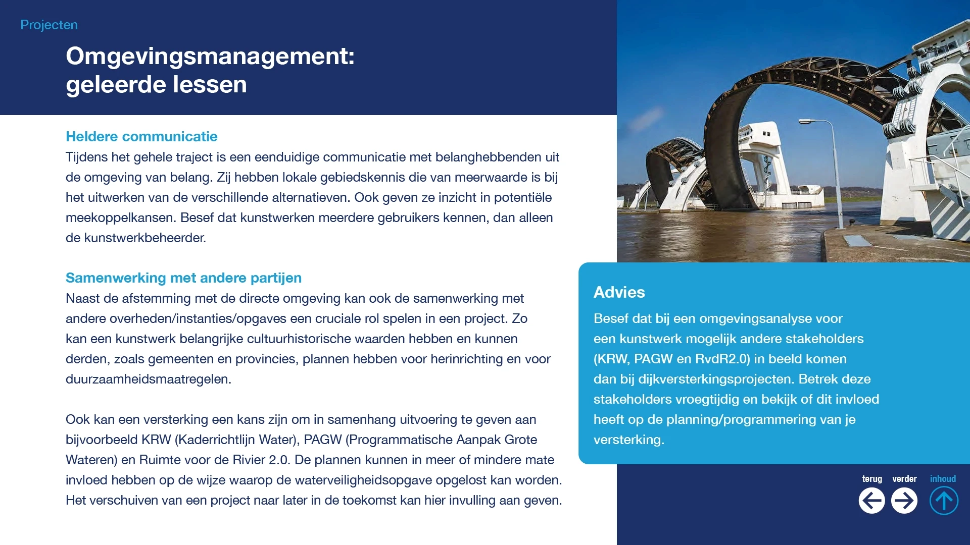 Speciale onderdelen in dijken, zoals sluizen en gemalen, worden door de professionals ‘kunstwerken’ genoemd. Vóór 2050 moet een groot aantal daarvan versterkt worden, als onderdeel van het Hoogwaterbeschermingsprogramma (HWBP). Vaak zijn dat langdurige processen. De waterschappen moeten er actiever mee aan de slag, vindt het projectteam Samenwerken aan Kunstwerken.