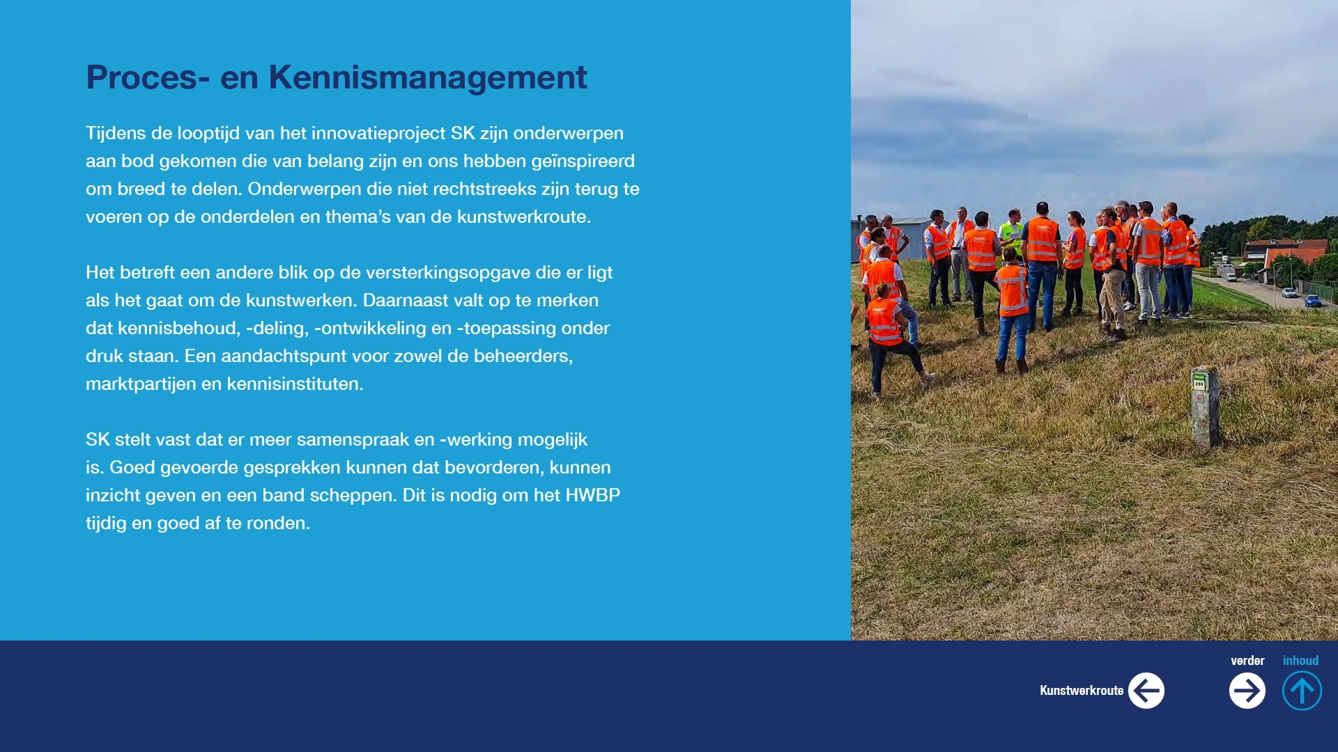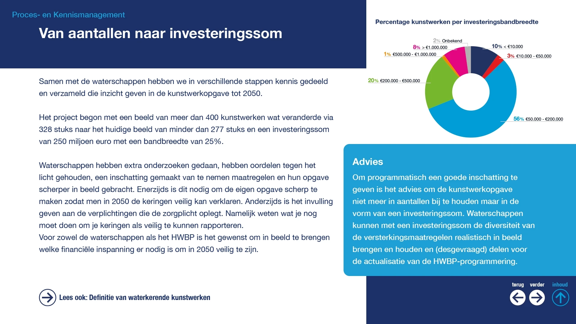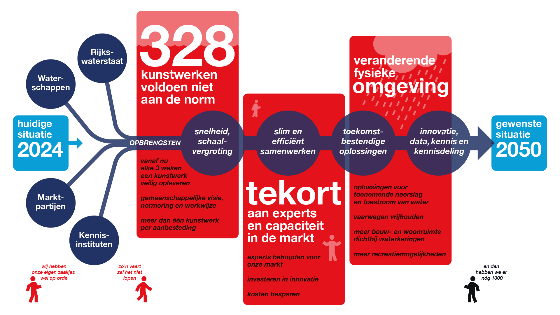 Stel het aantal kunstwerken dat versterkt moet worden centraal. 2050 lijkt ver weg, maar gezien de veranderende omstandigheden en de schaarste in de markt is de urgentie hoog. Benadruk de voordelen van samenwerking, kennisdeling en innovatie.